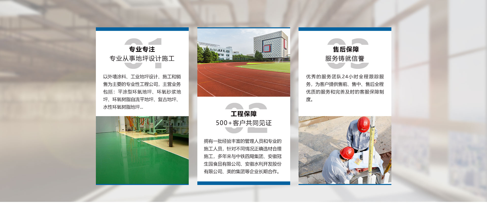 安徽世博裝飾工程有限公司成立于2009年,是一家以外墻涂料、工業(yè)地坪設(shè)計(jì)、施工和銷售為主要的專業(yè)性工程公司、是工業(yè)地坪施工的專業(yè)企業(yè)。公司設(shè)立了售后服務(wù)中心,用戶遍布全國大中小城市,一大批具有標(biāo)志性的長期合作伙伴。“世博公司”環(huán)氧地坪工程,受到了越來越多的不同行業(yè)用戶的好評(píng)及青睞。公司擁有一批經(jīng)驗(yàn)豐富的管理人員和專業(yè)的施工人員,以保障產(chǎn)品的成功應(yīng)用,用較小的代價(jià)獲得理想的效果,尤其在地坪涂裝方面優(yōu)勢突出。而且以好的品質(zhì)管理模式,向客戶提供“獨(dú)具魅力”、“性能優(yōu)異”、“質(zhì)量穩(wěn)定”的產(chǎn)品。公司主要產(chǎn)品包括:平涂型環(huán)氧地坪、環(huán)氧砂漿地坪、環(huán)氧樹脂自流平地坪、滾涂型防靜電地坪、自流平防靜電地坪、復(fù)古地坪、水性環(huán)氧樹脂地坪、彩色透水混凝土地坪、壓花壓模藝術(shù)地坪、金剛砂耐磨硬化地坪、混凝土密封固化劑地坪、乙烯基酯重防腐地坪、GEP 標(biāo)準(zhǔn)型地坪、彈性PU運(yùn)動(dòng)場地坪、塑膠跑道地坪,PVC橡膠地板、停車場地坪、無震...